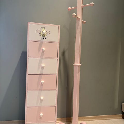 Rosa strykebrett med sammenleggbart design. Brettet har et fargerikt mønster og er lett å oppbevare. Praktisk for lek som stryking av klær i hjemmet.