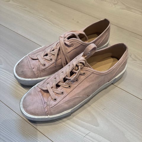 Sneakers i dus rosa farge. Bare brukt et par ganger for de ble for små for meg. Kjøpt på skomakeren i Stavanger for et par år siden og så glemt i skapet. Kan sende flere bilder om ønskelig.