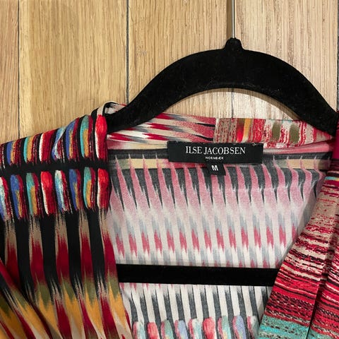 Farge svart med blomster i rosa, rød, lilla og hvit. Tynn glittertråd
