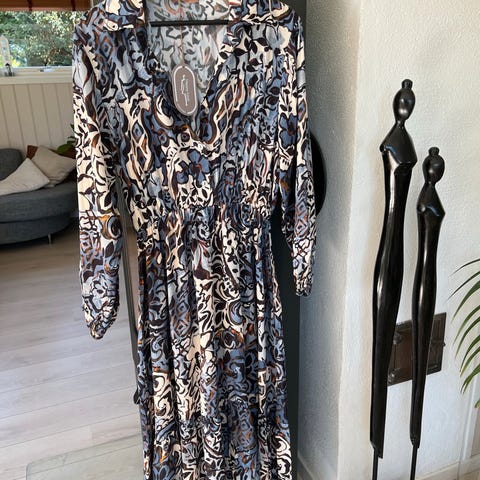 Ubrukt italiensk maxikjole fra Happy Look str Onesize m/tag. 100% viskose. Krage, knappestolpe i bryst. Løs strikk under byste og løs strikk inederst på ermene. Nypris kr 1.299,-. Pris er satt 😊