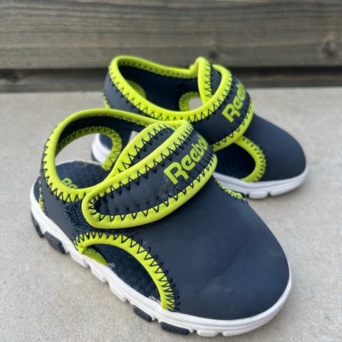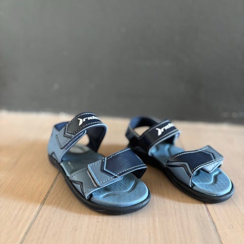 Selger et par fine barnesandaler fra Puma i størrelse 32. Farge: mørk blå med lyseblå og gule detaljer. Sandalene har borrelås for enkel justering og sitter godt på foten.