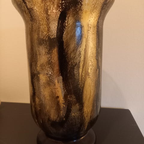 Raku kjennetegnes ved at gjenstanden tas glovarm ut av ovnen og legges i sagflis eller annet brennbart materiale, noe som skaper de karakteristiske mørke sprekkene og kontrasten mellom matt leire og blank glasur. Vasen har en vakker kombinasjon av naturfarget leire, glasur i metallisk bronse som flyter nedover fra halsen, og dyp blå glasur på innsiden.