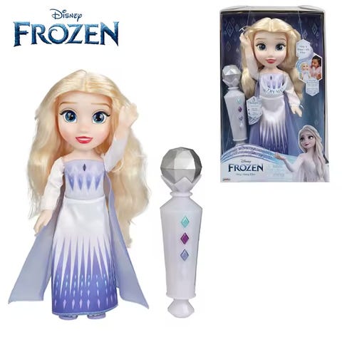 Elsa dukke med mikrofon. Det kommer musikk når man trykker på knappen på dukken, og den synger når man holder mikrofonen foran dukken.