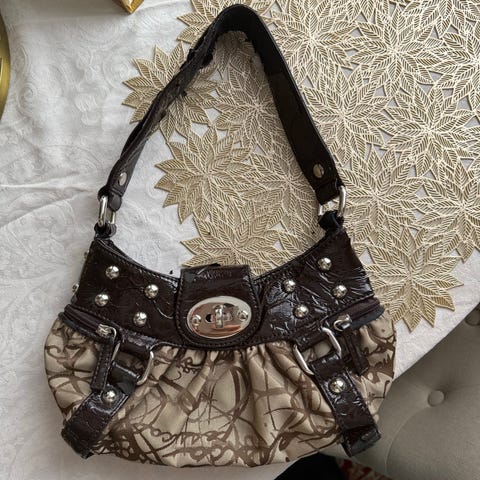 Interiør: En stor lomme og en innvendig glidelåslomme. Brunt skinn og mørk brun canvas.