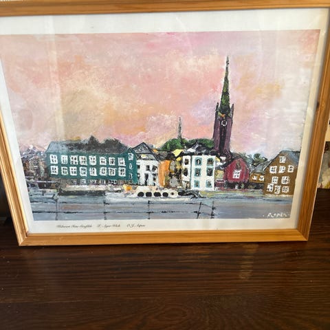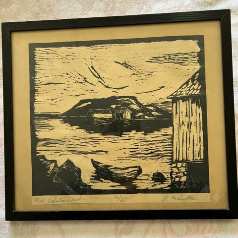 Et fint lite litografi eller trykk fra 1978 av en Beauchamp. Noen bruksspor på rammen. Må hentes.