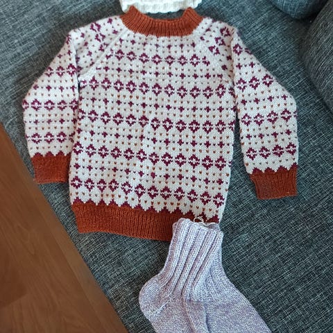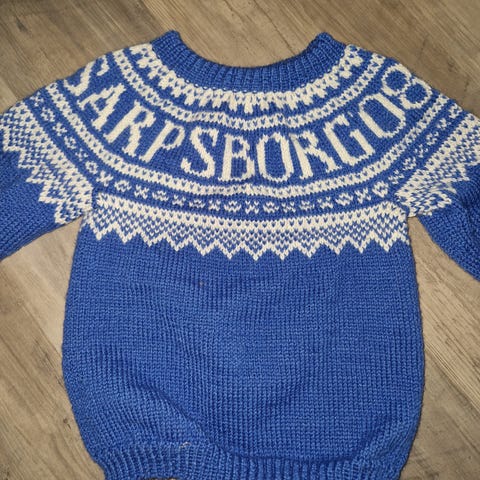 Strikket i Viking sportsragg. Den er god i str så den varer lenge. Sr 4 år. Ser at det har vært noe mørkt i tråden(se bilde) så selges billig
