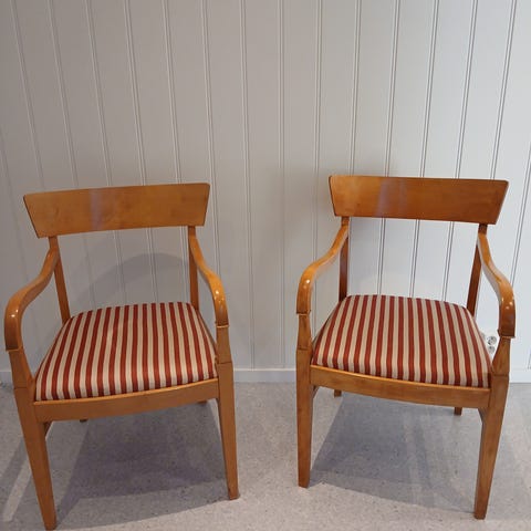 To fine stoler selges. Alder ukjent. De er i heltre og malt hvite. Jeg vil tro det er eik. Puten på den ene stolen bør fikses.