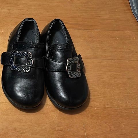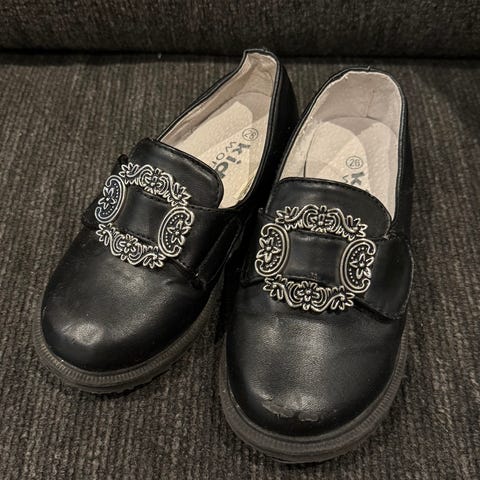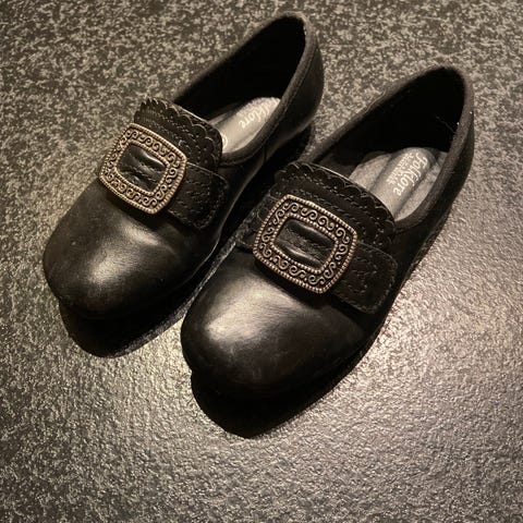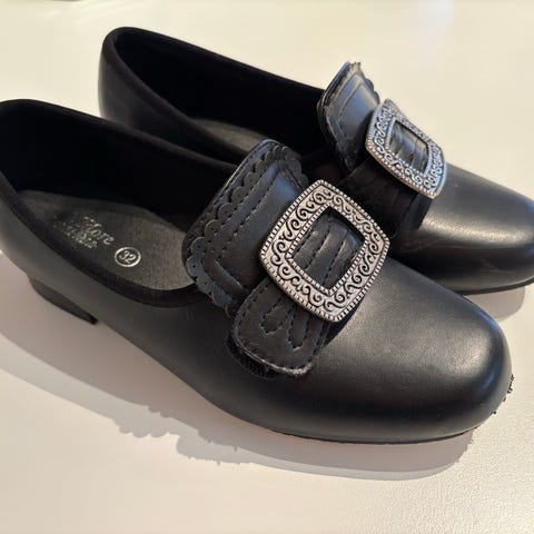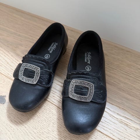 Pent brukte bunadsko fra Folklore, strl 26. Et par veldig små merker på tuppen. Synes ikke i bruk, og blir usynlige med litt skopuss. Nypris 499.