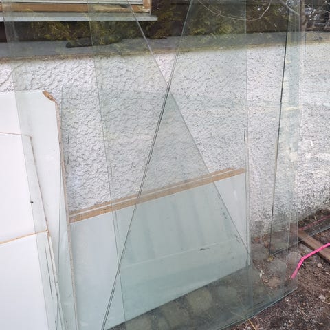 Herdet og kantslipte glass i forskjellig tykkelser og størrelser, 2 store 6 mm vanlig glass 2.10 x 1.00 mtr + stort innrammet speil 2.40 x 0.80 selges. Pris på forespørsel. 94249486.