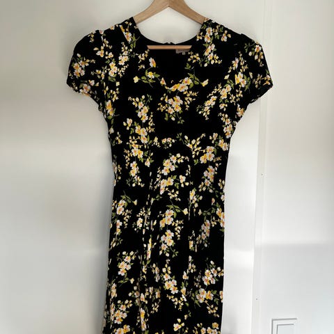 Kjole byTiMo selges. Den er luftig og deilig å ha på. Superfin med et smalt brunt belte i lives. Den er vid i stoffet, men henger rett den. Moderne høy hals..