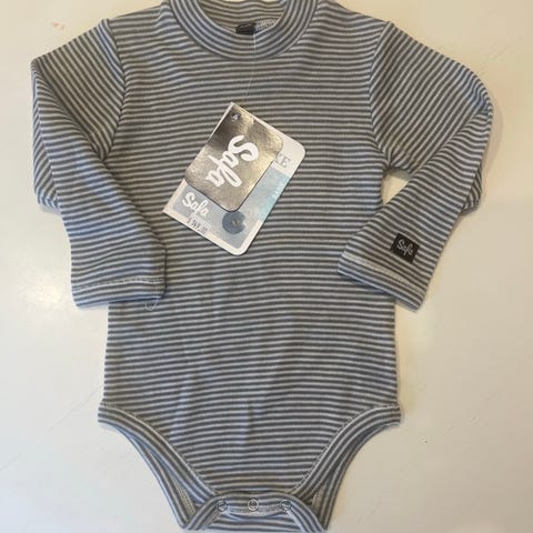 4 stk ullbodyer i str 70. Den med striper er fra Tom & Trine, mens de tre andre er fra Safa. Den med Fatorangen-motiv består av 100 % merinoull, mens de andre består av 80 % ull og 20 % silke. Ingen hull eller flekker
