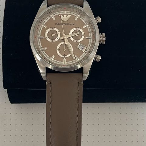 Emporio Armani beige men's chronograph watch AR0286 steel brown leather strap. Watch with 41 mm diameter steel case. Stainless steel bezel with polished and satin silver finish. Beige dial with 3 counters, date and Emporio Armani logo. Quartz movement only time. Brown crocodile print leather strap with buckle closure. 5 bar water resistance.