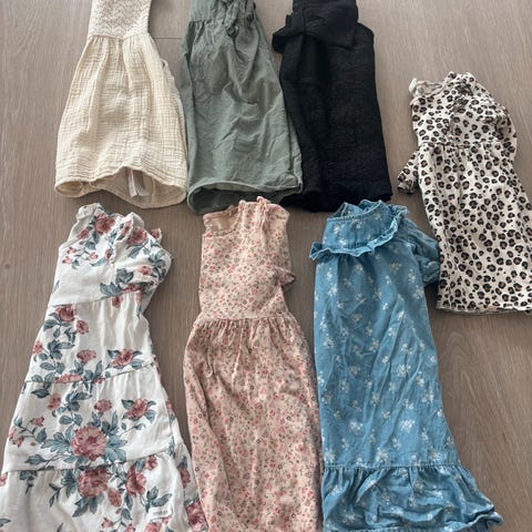 7 kjoler. Den lilla kjolen med blomster og den blå kjolen er godt brukt, ellers er resten lite brukt.