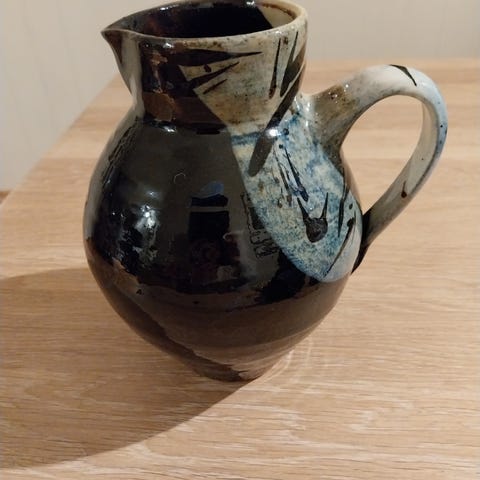 Flott mugge med spennende glasur med høyde på 18cm. Bittelitt slitasje ved tuten. Billigste porto blir 69kr med Postnord utenom fiksferdig.