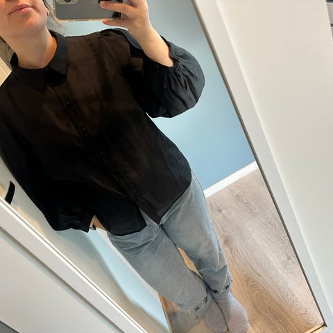 Bluse fra H&M, med knepping i front og liten legg bak. Str. 42