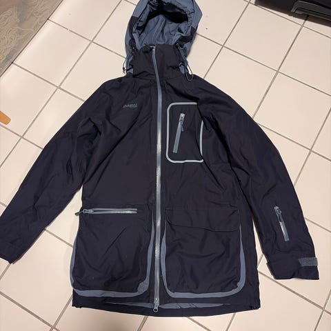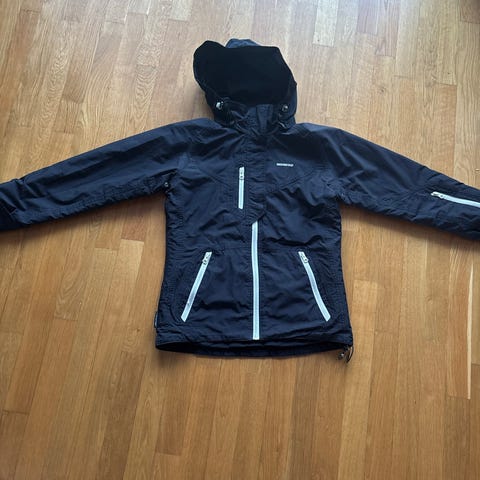 Pent brukt mørkeblå jakke. Tolags, med hette som kan reguleres bakpå. Tre lommer. Borrelås på ermene.