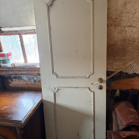Tre antall dører som ligger oppå hverandre mot veggen. En har speil, men som er desverre blitt knust, men som kan lirkes av å legge inn nytt om ønskelig. Passer til skyvedører innendørs eller utendørs.