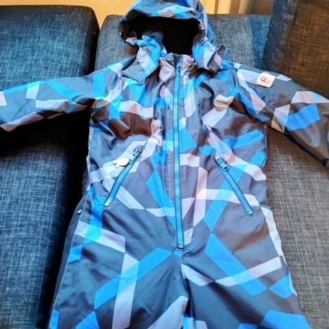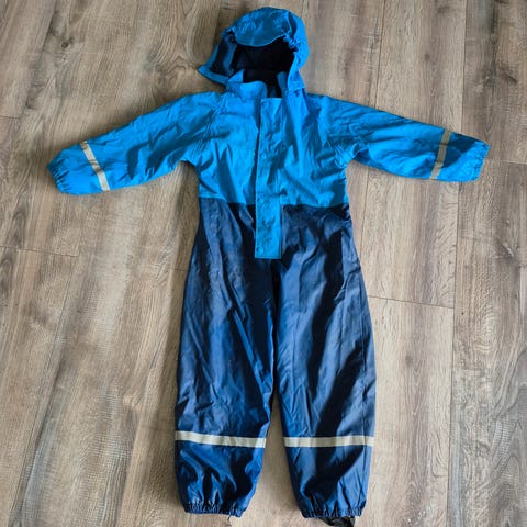 Graffiti regndress for gutter i størrelse 128. Denne regndressen er blå og laget for å beskytte mot regn og vind. Den har justerbare stropper og elastiske mansjetter for en komfortabel passform. Egnet for utendørsaktiviteter i vått vær.