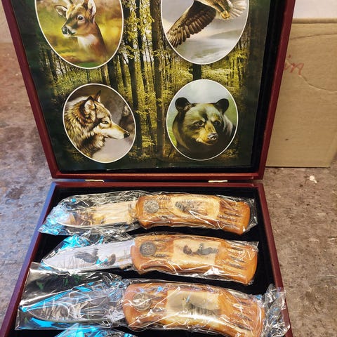 Meget bra stand, muligens ikke brukt. Lengde 16,4 cm på knivene. Liten defekt på kanten av esken.