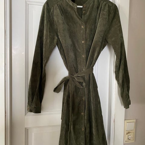 Myk kordfløyelkjole i str xs fra freequent. Lommer i siden og knytebelte. Fin grønnfarge. Inneholder 85% polyester, 12% polyamide og 3% elastan.