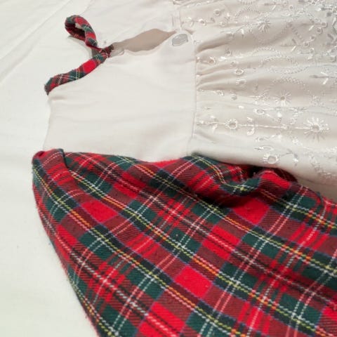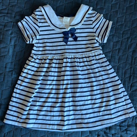Nydelig kjole i 100% bomull. Fra 80-tallet men ble nok bare brukt på en 17.mai. Fortjener noen selskaper til! Står str 3 år men made in Portugal og tilsvarer mer 2 år/92 i norsk str tror jeg. Mulig skyggeflekk foran, ikke gått bort i maskinvask 30 grader me milo.