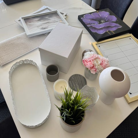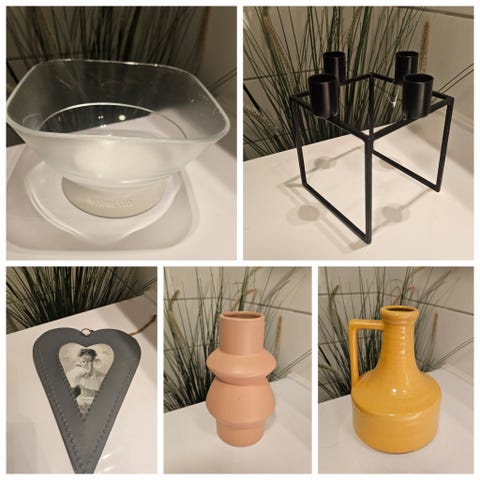 Dekorpakke, 3 hyller, pute, 2 korktavler, kurv, 3 potter, må hentes!!