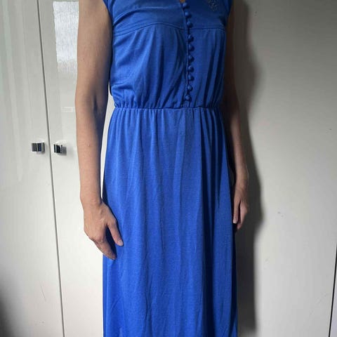 Søt vintagekjole med knytting oppå skuldrene. Skjørtdelen har innerskjørt.. Polyester. Kan hentes i Stavanger