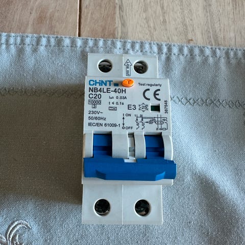 Aldri brukt elektronisk jordfeilautomat Chint NB4LE-40H 30mA, 2P 2 modul. Mer nøyaktig grunnet intern elektronikk. Utløsestrøm 27mA +-2mA. Jordfeilautomat skal ha tilførsel i bunn. 10kA bryterevne iht IEC EN 61009-1.