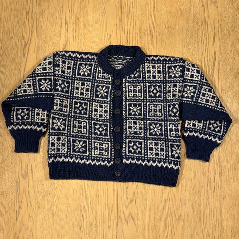 Nydelig hjemmestrikket genser, blå og hvit. Brukt et par ganger bare. Kan sendes.