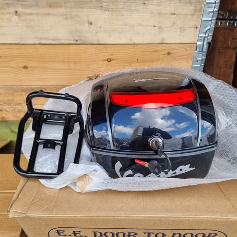 3) Brukt eksos til Vespa LX50 totakt, uten restriktor/motstand., så gir full-effekt «de-restricked» . Rustbehandlert og nylakkert med varmebesrandig lakk. Noe har løsnet inni så anlegget er ganske bråkete.