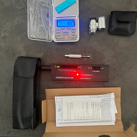Etui med skålvekt til carat / karat, til å veie diamanter. Følger med alle lodd, og pinsett
