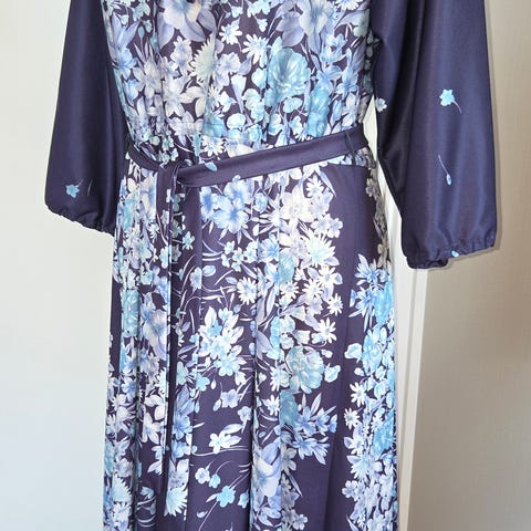 Selger en vintage 70-talles kjole / tunika med tilhørende belte. I perfekt stand, alle originale knapper på plass, samt belte. Virker omtrent ubrukt. Vakkert blått mønster. Den er i tynt deilig bomuldsstoff, men har underkjole så den er ikke gjennomsiktig med unntak av armene. Str 42 vintage størrelse (liten i str), passer str-s-m. Kjolen måler 40 cm skulder til skulder, lengde ca 103 cm, mål armhule til armhule ca 50 cm.