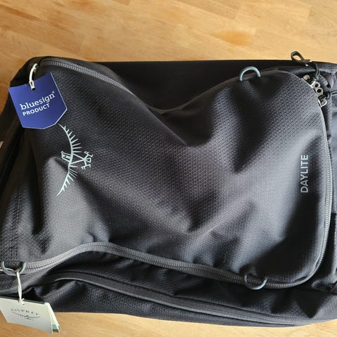Praktisk og god bæremeis fra Osprey. Den er brukt et par ganger. Fremstår som ny. Gult regntrekk følger med i ene lommen. Ellers god plass til diverse i ulike lommer, med best plass nederst.