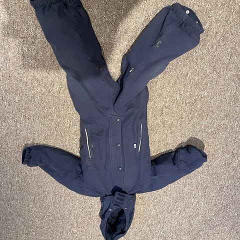 En sett fleecefôret regntøy som passer barn 98/104 størrelse. Fin brukt men en liten skade se på bilder, derfor selger billige. 🙂
