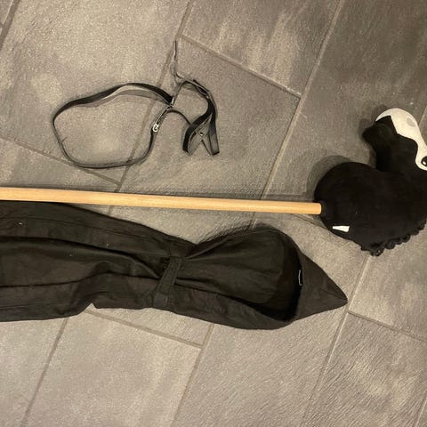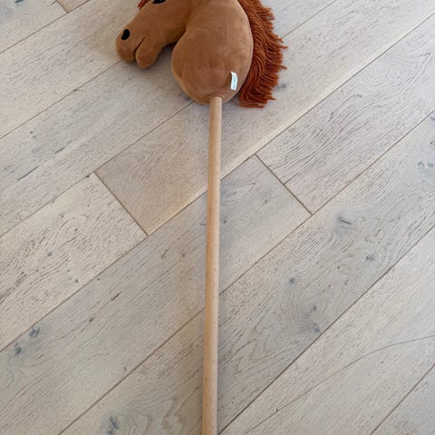 Fint brukt Kjepphest med myk pels i polyester, og med garnman som kan flettes. Munn som kan åpnes og lukkes med borrelås, slik at bittet ligger godt på plass. Trepinne som kan sages til egnet lengde. Total lengde ved levering er ca. 100cm, hvorav pinnen er ca. 70