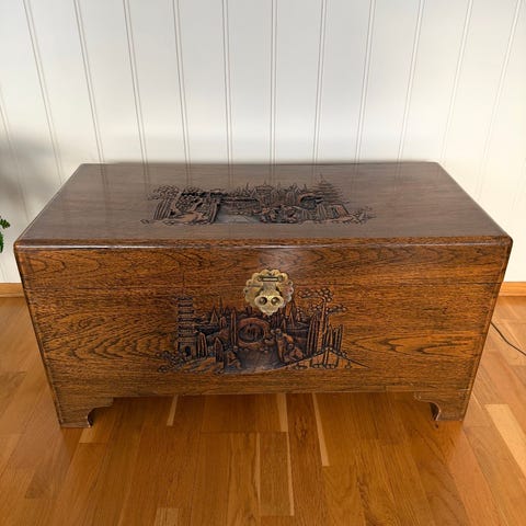 Kisten har vært brukt til oppbevaring av ulltøy og tekstiler. Den har alltid stått skjermet og det har ikke vært oppbevart gjenstander på lokket.