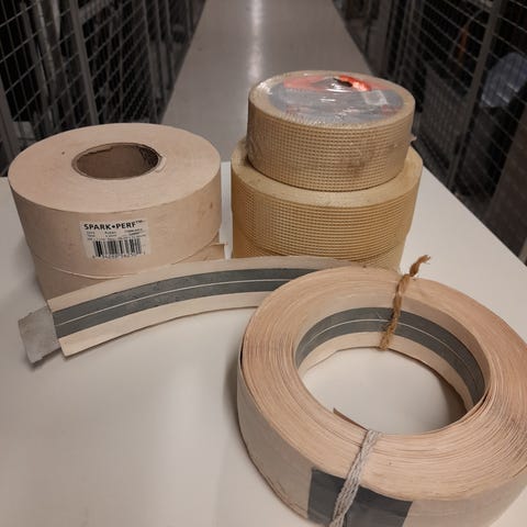 selger hvit og sort gaffateip, fortsatt pakket i plastikk. Koster originalt 85kr per rull