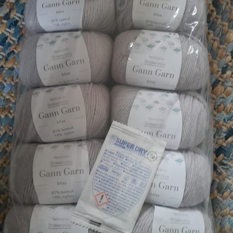 Ett nøste mangler magebånd. Startet på et prosjekt og nøstet opp det lille jeg hadde strikket. De andre nøstene er uåpnet. Alle samme innfarging