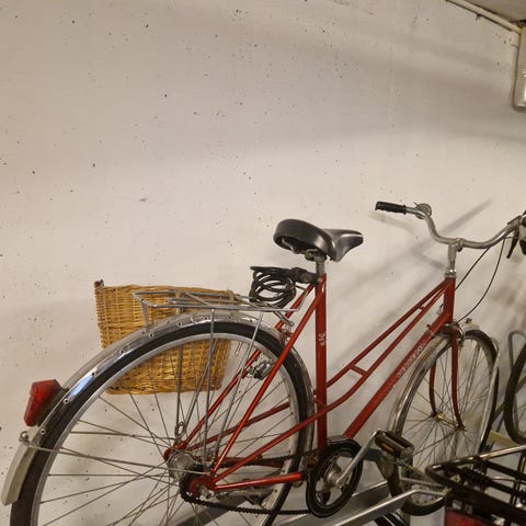 Sykkelen har stått lagret i garasjen og har ikke blitt brukt på mange år. Trenger nye dekk. Bremser og gir må sjekkes før bruk. Har ikke nøkkelen til sykkellåsen.