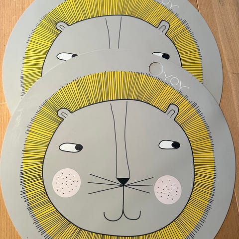 Tøff og søt spisebrikke/spiseunderlag i silikon. 39 diameter. Løve/lion motiv. Lett å rengjøre. Lite brukt. Kjøpt på Illums i København for noen år siden, men ble fort litt barnslig og har lagt en stund i et skap.