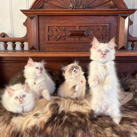 Begge foreldrene har supert gemytt og er rasetypiske og vakre ragdoller. Begge bor hos oss. De kommer fra kjente linjer uten inavel, HCM eller PKD. Kattungene vokser opp hjemme sammen med andre katter blir godt sosialisert. Renraset Ragdoll er snill, hengiven, kjærlig, intelligent, tillitsfull og kattungen maler alltid🥰 de er godt sosialisert fra fødselen og vil være vant til barn/høye lyder og normalt familieliv. De er veldig personlig.😻