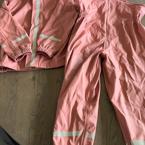 Svært pent regnsett brukt hjemme. Mangler trykkknappen nederst på jakken , men den er kun estetisk. Herlig snitt og flott lilla farge.