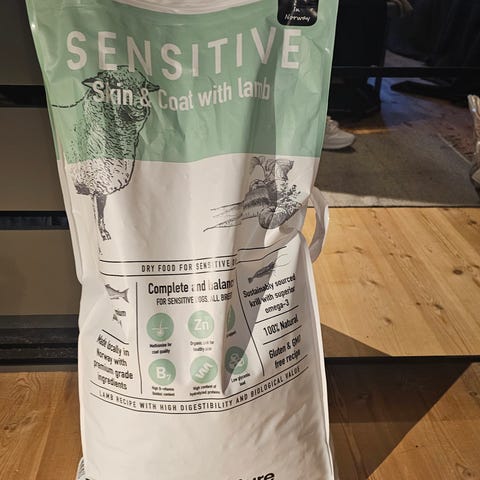 Norskprodusert merke med høyt innhold animalske produkter, lite prosessert. Nypris for 12kg sekk er rundt 749kr. Tror det er ca 8kg igjen i sekken.