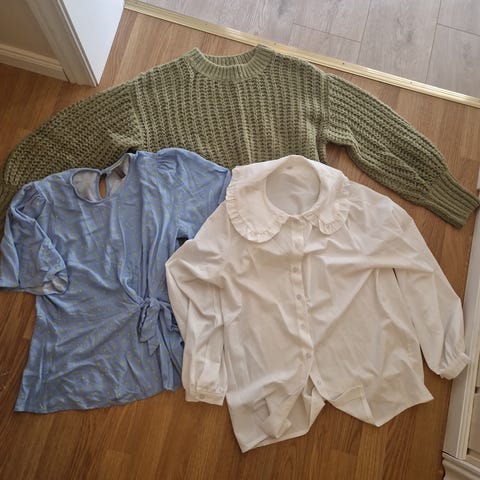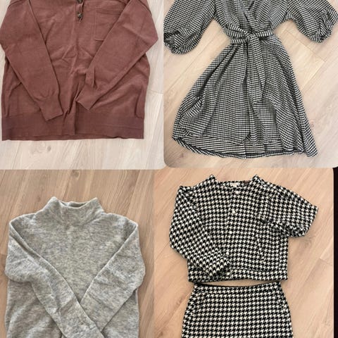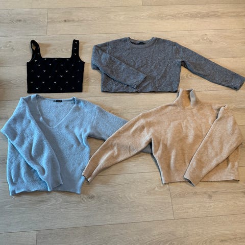 Pent brukte gensere og en skjorte, tilsvarende str. 38.