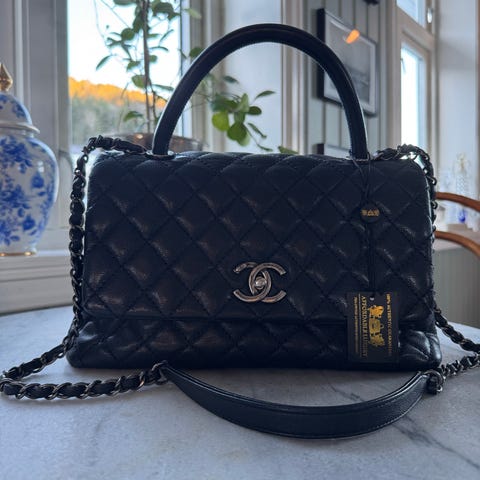 Vurderer å selge min vakkerskatt fra Chanel. Coco Handle i str Small i den vakreste gule fargen. Kaviarskinn med gull metall. Vesken er pent brukt men har litt slitasje på hjørnene. Innsiden er strøken og den har null lukt av parfyme eller andre dufter.