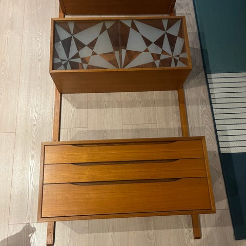 Liten pakke deler til teak seksjonen Bruksbo. Et barskap, en dyp hylle og 2 grunne. Selges samlet.