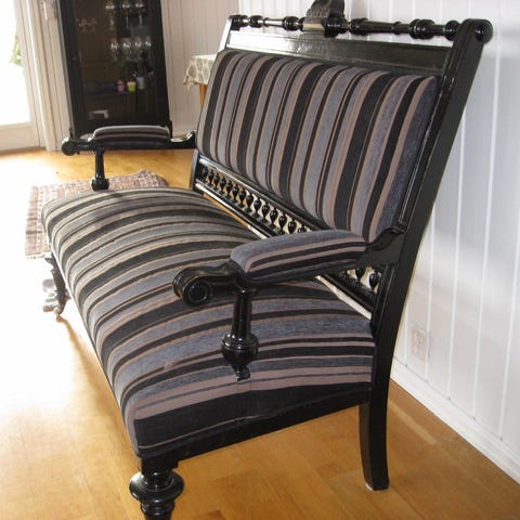 Vi selger vår nydelige biedermeiersofa. Den er trukket om av møbeltapetserer i sort ullstoff, og det kostet langt mer enn salgsprisen. Stoffet er dansk ullstoff, det samme som er brukt på rådhuset i København. Lite brukt etter omtrekking. Ikke dyr eller røyk.