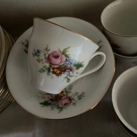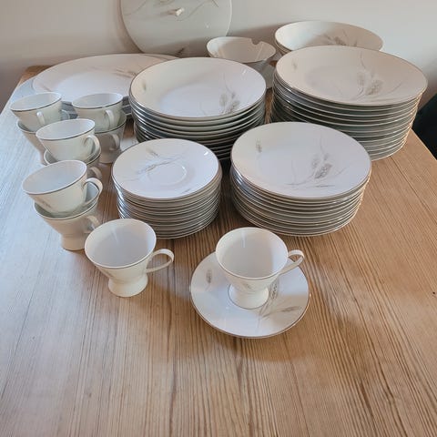Mosons servise. Settet inkluderer kaffekanne, melkekanne og tallerkener. Elegant design med dekorative detaljer, ideelt for servering av kaffe eller te. Perfekt for både hverdagsbruk og spesielle anledninger.