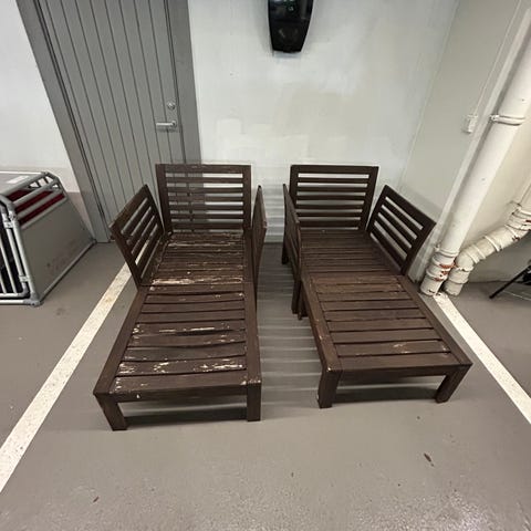 Alle stolene er i god stand, stødige og uten bøyde pinner. Litt mangel på beis som det alltid blir.