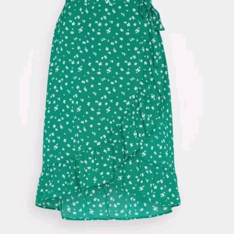 Vakkert omslagsskjørt fra svenske By Malina i lekker sateng med rysjer og mønster av villblomster. MERK: Merket S, men passer meg som er M nå mye bedre enn da jeg var S (opplevde at det var mye stoff «til overs» da jeg var en S) så denne passer i praksis en M.